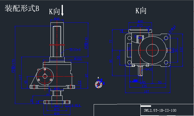 結構型式分為1型:蝸輪與螺桿為螺紋連接,螺桿作軸向運動;2型:蝸輪與螺桿為鍵連接,螺桿上配螺母,螺桿上的螺母作軸向運動。1型結構型式又分為兩種裝配型式即A:螺桿工作端在上;B螺桿工作端在下。2型結構型式也有兩種裝配型式即:A:螺桿工作端在上,螺母上頂或下拉;B螺桿工作端在下,螺母下壓或上拉。