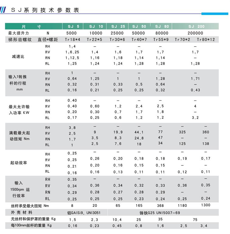 SJ系列升降機(jī)有_的設(shè)計(jì),緊湊的箱體,比MA系列價(jià)格更低,工作制也低。MA系列齒輪箱體設(shè)計(jì)更適合于重負(fù)載、高工作制的場(chǎng)合。SJ系列的負(fù)載范圍在0.5噸~20噸之間,推桿線速度_快可達(dá)到30mm/s,輸入速度_為1500r/min;輸入形式多樣,10分鐘的工作制為20%,工作環(huán)境溫度為-10℃~70℃;而MA系列的負(fù)載_可達(dá)到35噸,輸入速度更是_達(dá)到3000r/min,可提供雙頭三頭絲桿和滾珠絲桿;附件配置多:限位開(kāi)關(guān),防塵罩,安全螺母,防反轉(zhuǎn)裝置。10分鐘的工作制為30%(環(huán)境溫度為-10℃~70℃)。