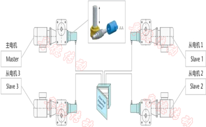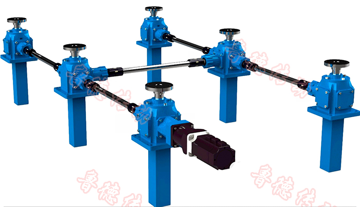 絲桿升降機(jī)與轉(zhuǎn)向器、連接桿、聯(lián)軸器等附件組合,用一臺電機(jī)驅(qū)動,保 證平臺同步穩(wěn)定運(yùn)行。在無法布置機(jī)械聯(lián)動的工況中還可采用電氣控制實(shí)現(xiàn)聯(lián)動,以絕 對值編碼器以及PLC控制來實(shí)現(xiàn)同步定位精度。