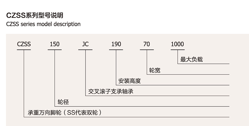 CZSS輪芯采用精密鑄鐵或精密壓鑄鋁合金成型,回轉機構采用專 業設計的非標滾珠軸承,經特殊工業制造,已達到轉動靈活、抗沖擊、耐疲勞的作用。輪面采用化學反應澆鑄的優 質進口聚氨酯彈性體,行走噪音低、無壓痕、保護地面、耐磨、抗切割。