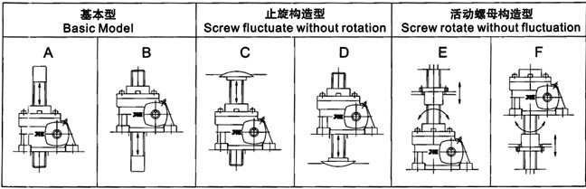 1、基本形式:螺母(蝸輪)轉(zhuǎn)動(dòng)絲桿上下移動(dòng),此為普通型升降機(jī)安裝方式。