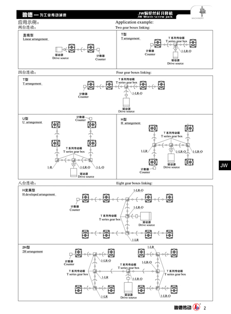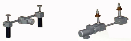 左上1圖:為2臺絲桿升降機聯動,電機在中間,電機連接轉向箱或者減速機,在通過連接桿和聯軸器連接升降機,使其能夠同步上升或者下降。