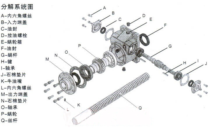 蝸輪絲桿升降機(jī)蝸輪采用國(guó)標(biāo)9-4銅蝸桿材質(zhì)為40Cr,絲桿一般采用45#鋼,也可根據(jù)用戶特殊需要定制不銹鋼絲杠。絲桿升降機(jī)蝸桿和絲杠都_經(jīng)特殊熱處理及蝸桿磨磨制。
