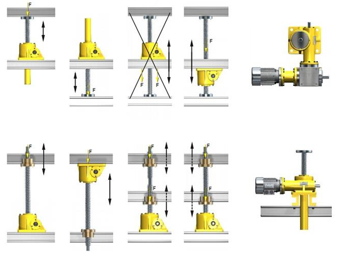 螺旋絲桿升降機(jī)安裝時(shí)應(yīng)注意不同結(jié)構(gòu)型式、不同頭部型式的安裝方法,錯(cuò)誤的安裝方法將會(huì)對(duì)絲桿升降機(jī)造成嚴(yán)重的損壞。下面我們來通過幾張圖例了解一下蝸輪絲桿升降機(jī)的安裝注意事項(xiàng):