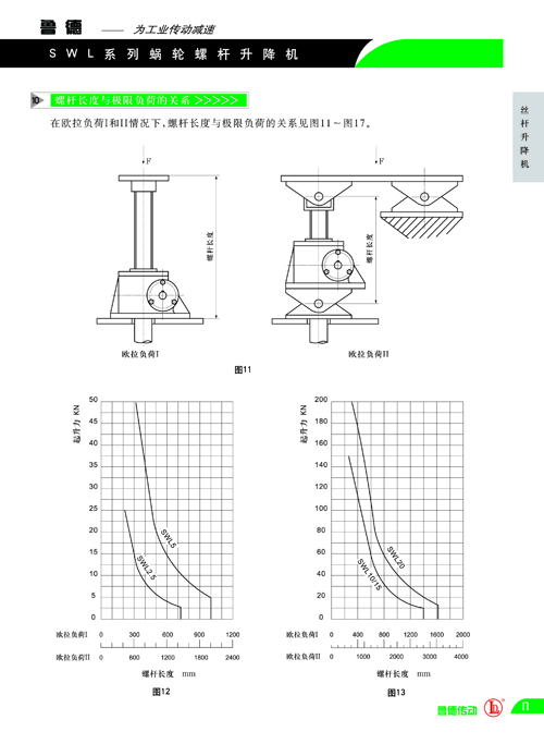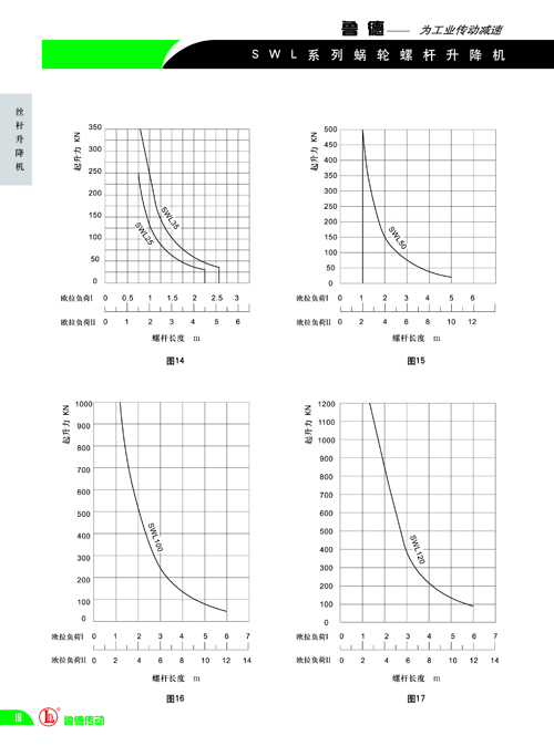 上圖給出了允許彎曲力矩下,螺桿的長度與_負荷的關系。根據螺桿的行程和起升負荷,查出所需升降機的型號,再根據查出的升降機型號和起升負荷查出蝸輪絲桿升降機的在不同起升負荷下允許的起升速度,若查出的起升速度滿足不了要求,則須選用型號大一規格的升降機,直至滿足要求。