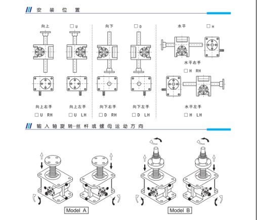 SJ蝸輪絲桿升降機,蝸輪絲桿升降機,螺旋絲桿升降機有絲桿運動螺旋升降機和螺母運動螺旋升降機兩種運動形式。絲桿運動式即蝸輪旋轉(zhuǎn)驅(qū)動絲桿直線運動;運行中絲桿不旋轉(zhuǎn),絲桿運行上下需有足夠空間。螺母運動式即絲桿與蝸輪固定,驅(qū)動螺母上下直線運動,運行中絲桿旋轉(zhuǎn)。