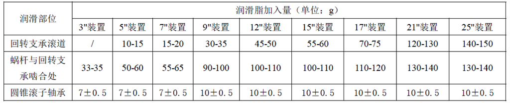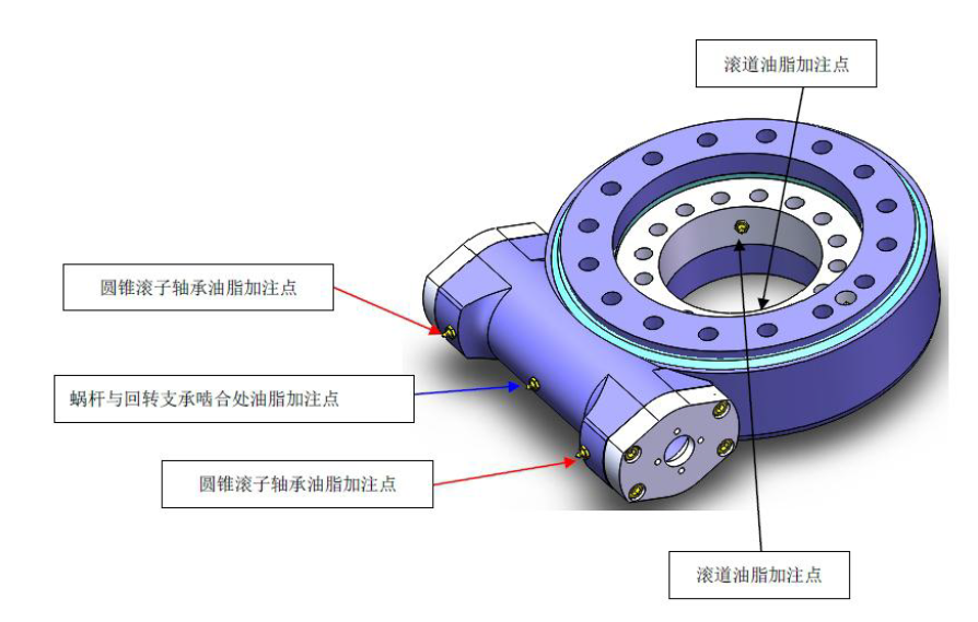 減速機有三處需要加以潤滑,分別為回轉支承滾道、蝸桿與回轉支承嚙合處和圓錐滾子軸承。回轉支承滾道和圓錐滾子軸承出廠前已經加注潤滑脂,蝸桿與
