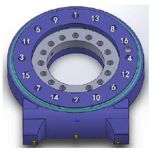從內圈或外圈開始,將所有螺栓進行對角擰緊至30%擰緊力矩,然后重復對角扭緊至50%擰緊力矩,_后對角擰緊至_擰緊力矩。