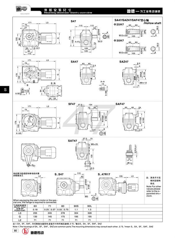 S47可配電機功率為0.18KW~1.5KW;速比11.46~244.74;結構型式有軸裝式A、軸伸法蘭式F、軸裝法蘭式AF、軸裝小法蘭式AZ、軸裝帶防轉臂式AT;