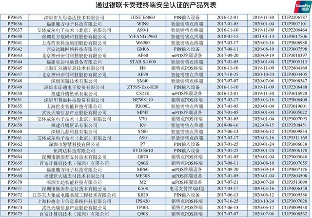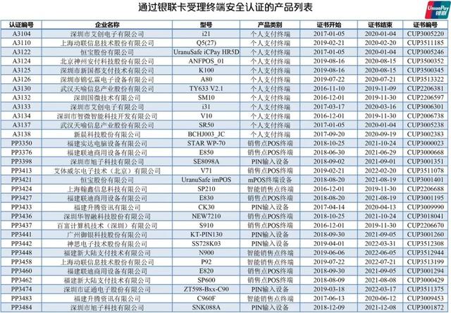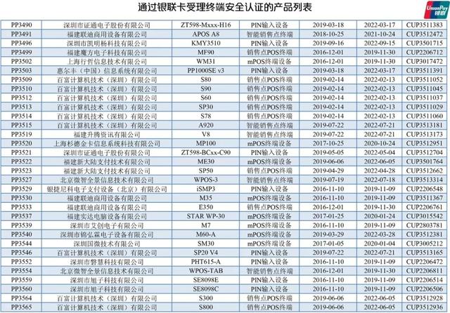文章導(dǎo)讀:中國(guó)銀聯(lián)官網(wǎng)更新了【通過銀聯(lián)卡受理終端安全認(rèn)證的產(chǎn)品列表】。銀聯(lián)卡受理終端設(shè)備指的是能完成銀聯(lián)卡交易的受理設(shè)備及其安全組件,包括但不限于電話支付終端、mPOS終端、金融自助終端,智能銷售點(diǎn)終端以及其他新型終端產(chǎn)品及PIN輸入設(shè)備等終端安全組件。
